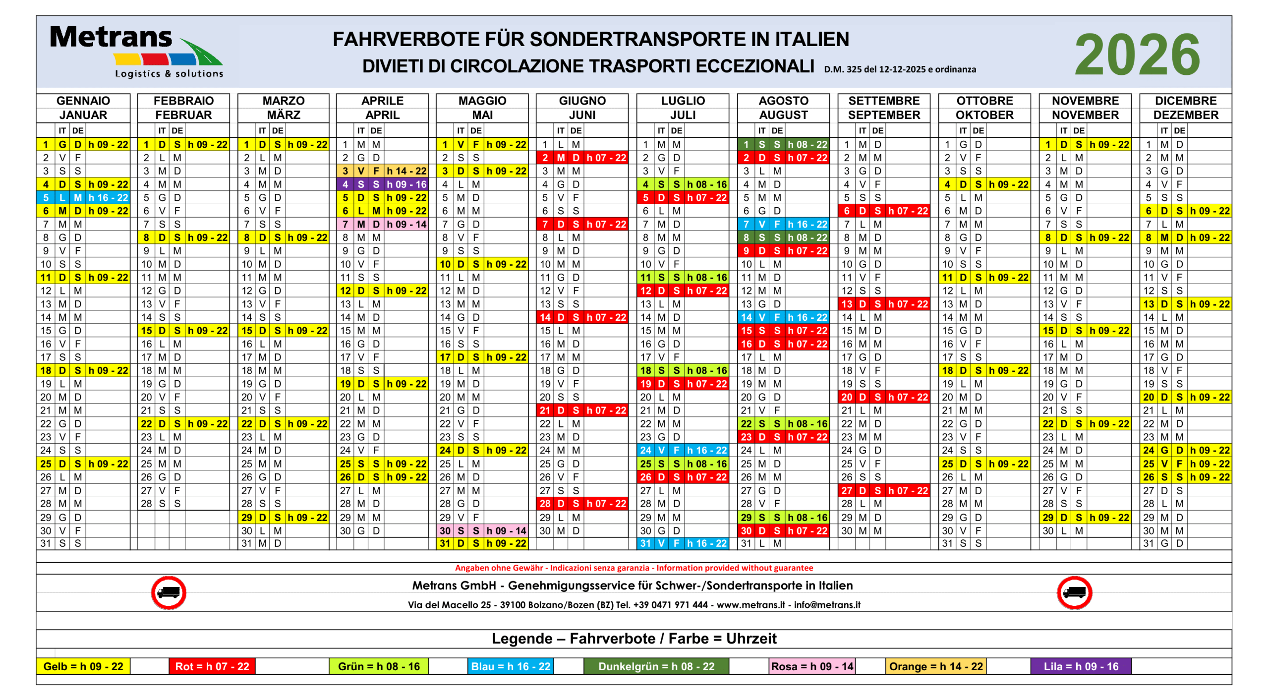 ACHTUNG: Am Montag, den 22.12.2025, hat die Autobahngesellschaft ASPI (Autostrade per l’Italia S.p.A.) den Fahrverbotskalender 2026 für Schwer- und Sondertransporte auf ihrem Autobahnnetz veröffentlicht, den wir Ihnen untenstehend präsentieren.Wir möchten darauf hinweisen, dass der Fahrverbotskalender für Schwer- und Sondertransporte in Italien für das Jahr 2026 derzeit nur vorläufig ist. Änderungen oder zusätzliche Einschränkungen durch AISCAT (Associazione Italiana Società Concessionarie Autostrade e Trafori) bleiben vorbehalten. Wir werden Sie über mögliche Updates auf dem Laufenden halten.